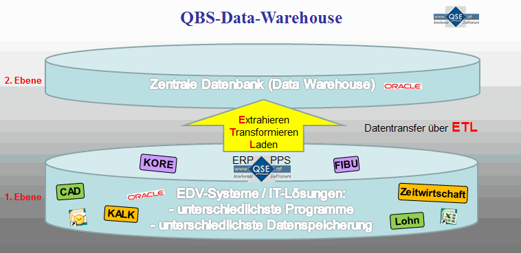 Die Übernahme der Daten ins "Data Warehouse" aus unterschiedlichen Systemen erfolgt meist durch ein kostengünstiges ETL-Tool (FlowHeater) das über QSE angekauft werden kann.